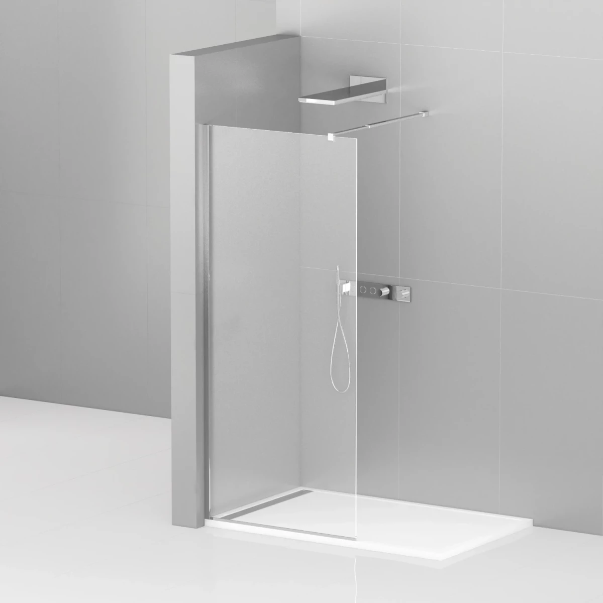 Стеклянная душевая перегородка Cezares Liberta L-1 90 LIBERTA-L-1-90-C-Cr со свободым входом с одной стороны. Верхний телескопический кронштейн позволяет регулировать ширину входа.