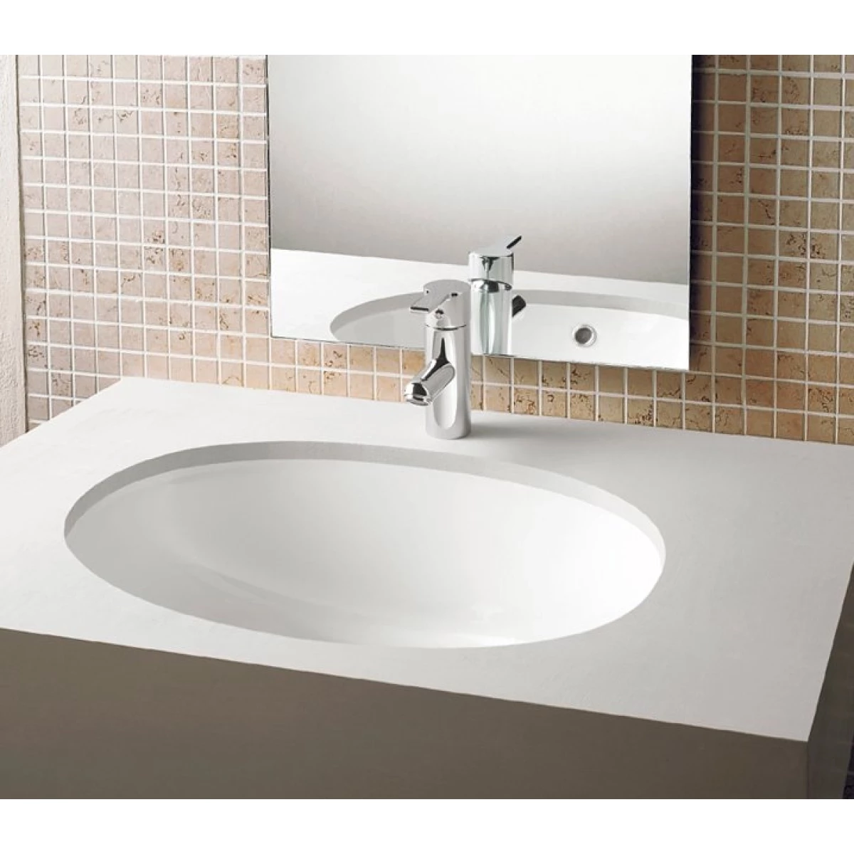 Раковина Ovale EN 262 встраивается снизу под столешницу, керамика. Приятная округлая форма. Накладная круглая раковина подойдет любителям завершенных форм, будет удобна при компактном размещении сантехники, одно отверстие для смесителя.